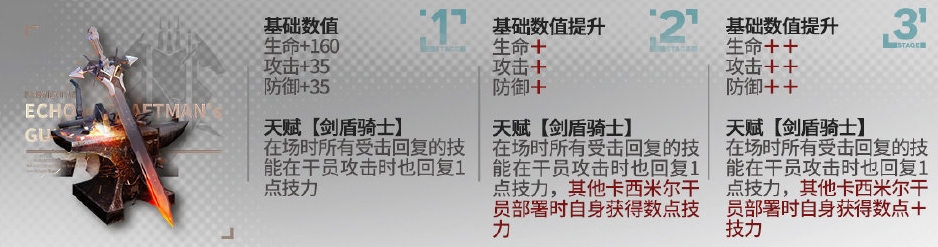 在场时所有受击回复的技能在干员攻击时也回复1点技力,其他卡西米尔干员部署时自身获得数点技力