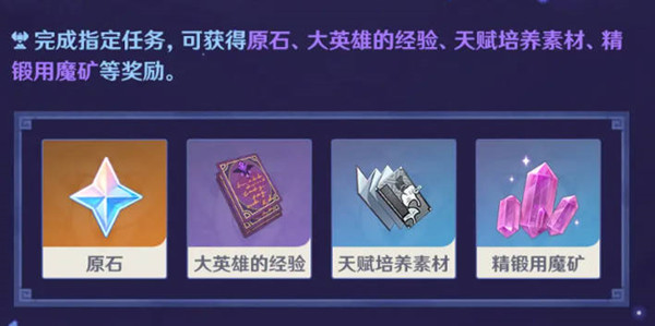 4、我们完成指定的任务,就可以获得原石,大英雄经验,天赋培养素材,精锻用魔矿等等的奖励了,奖励的内容比较常规,依旧是这些东西,当然了,任务中的原石奖励是我们的终极目标就是为了这个去完成任务。