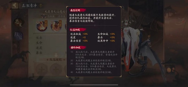 2、升级个人buff会提高自身式神和SP大夜摩天阎魔的属性,以及SP大夜摩天阎魔的技能等级,升级团队buff会给出场队伍提供各种团队技能加成,有增加阎魔老师输出的、有增加多段伤害输出的、有增加单段伤害输出的,根据阵容需要搭配。