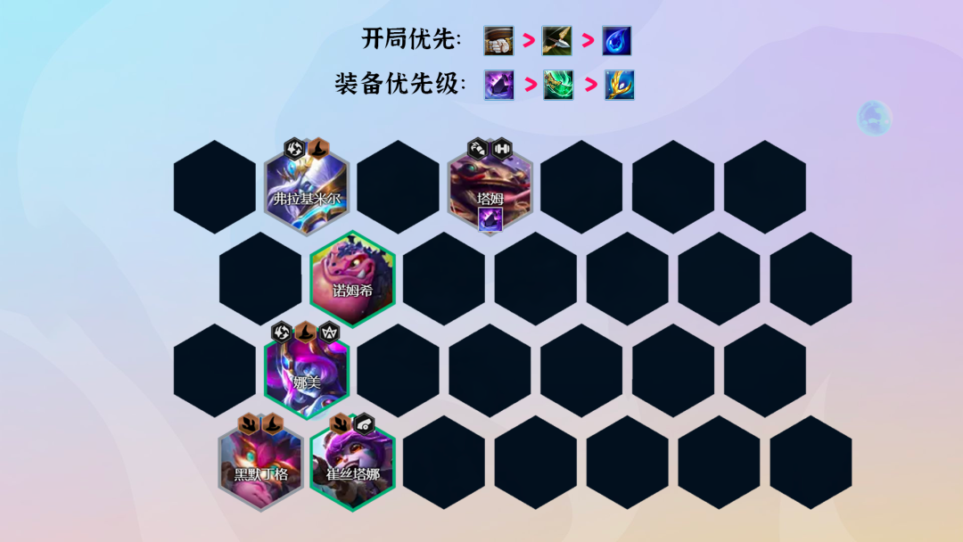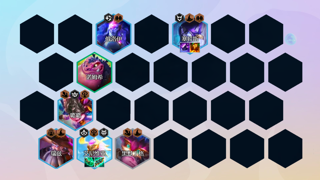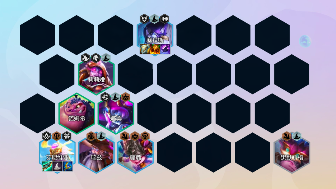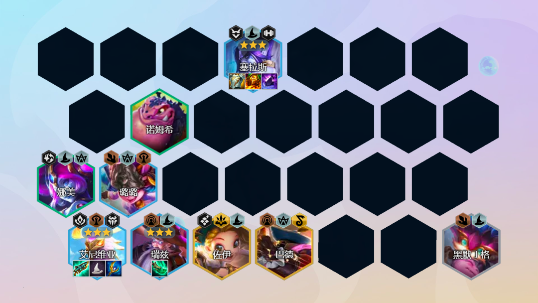 阵容组成:黑默丁格、娜美、璐璐、艾尼维亚、璐璐、塞拉斯、瑞兹、巴德、佐伊