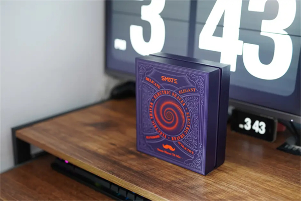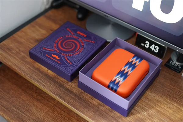 须眉剃须刀T6M礼盒包装还是较为华丽的,产品同色调外观基础上,丰富的花纹凸显出剃须刀强力T恤的特点,品牌LOGO和定位需求也以图片形式展现出来,打开外包装盒的盖子,可以看到橙色素皮收纳包放置在里面。