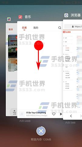 1)首先我们从屏幕底部往上滑动唤出任务管理器,在任务管理器中找到要分屏显示的第一个应用,接着安装那个应用卡片往下滑动,这时在应用卡片上方就会出现【分屏】图标,点击它。(如下图)