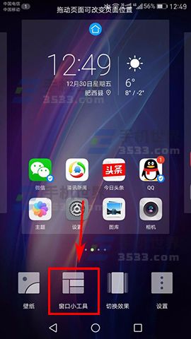 1)先在手机的桌面空白处长按,长按后就会进入桌面编辑模式,点击下方工具栏中的【窗口小工具】。(如下图)