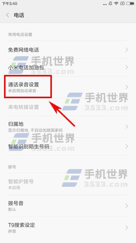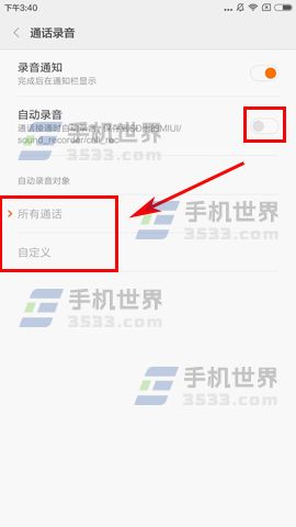 2)接着点击【通话录音设置】,然后把【自动录音】右边的开关打开,再设置好【录音对象】,这样跟设置的录音对象进行通话时,系统就会自动录音了。(如下图)