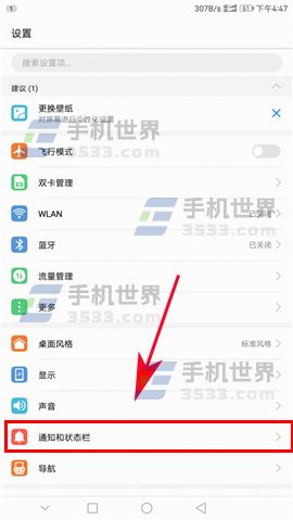 1)打开手机的【设置】,进入设置菜单后点击【通知和状态栏】选项。(如下图)
