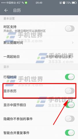 2)进去后找到【显示农历】后再点击旁边按钮的【白色部分】就可以设置农历显示了。(如下图)