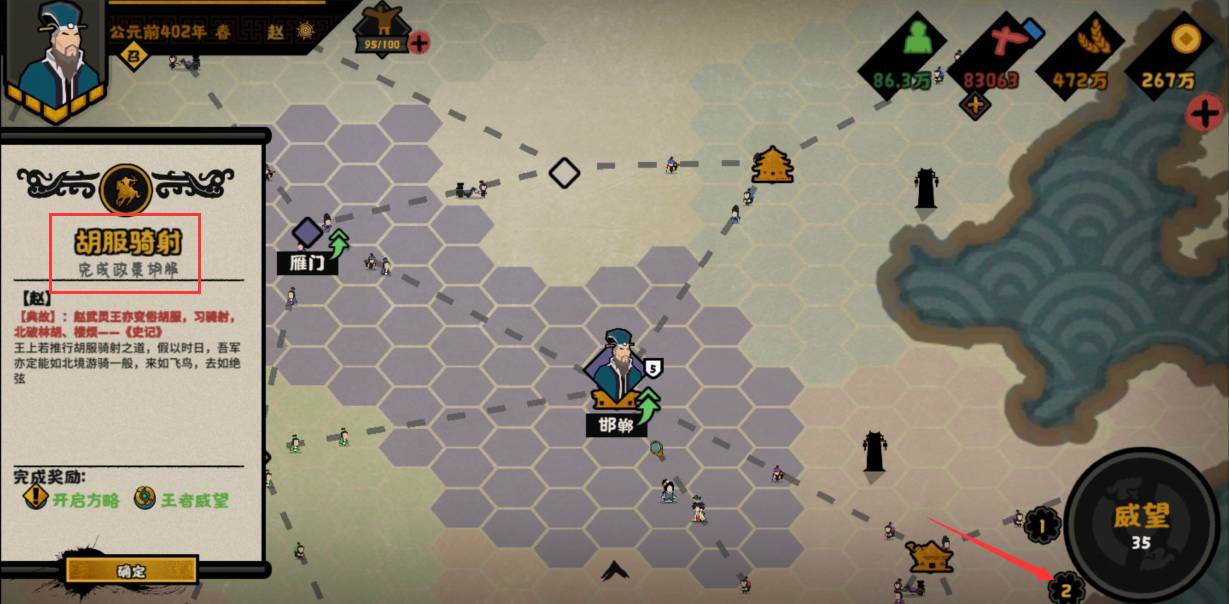 1、想要完成胡服骑射事件就需要成功施行政策胡服,而施行政策的图标在右下角。