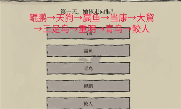 选择顺序:鲲鹏→天狗→蠃(luǒ)鱼→当康→大鵹(lí)→三足乌→重明→青鸟→鲛人