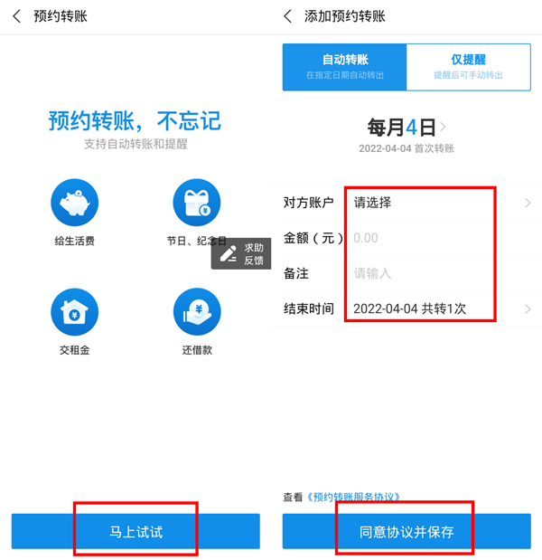 3、点击下方的马上试试,将转账信息设置号之后,点击同意协议并保存即可。