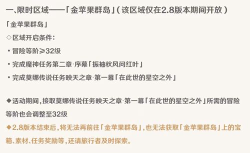 6、2.8版本结束以后,玩家将无法在前往金苹果群岛,也无法收集金苹果群岛上的宝箱,材料,任务奖励等。