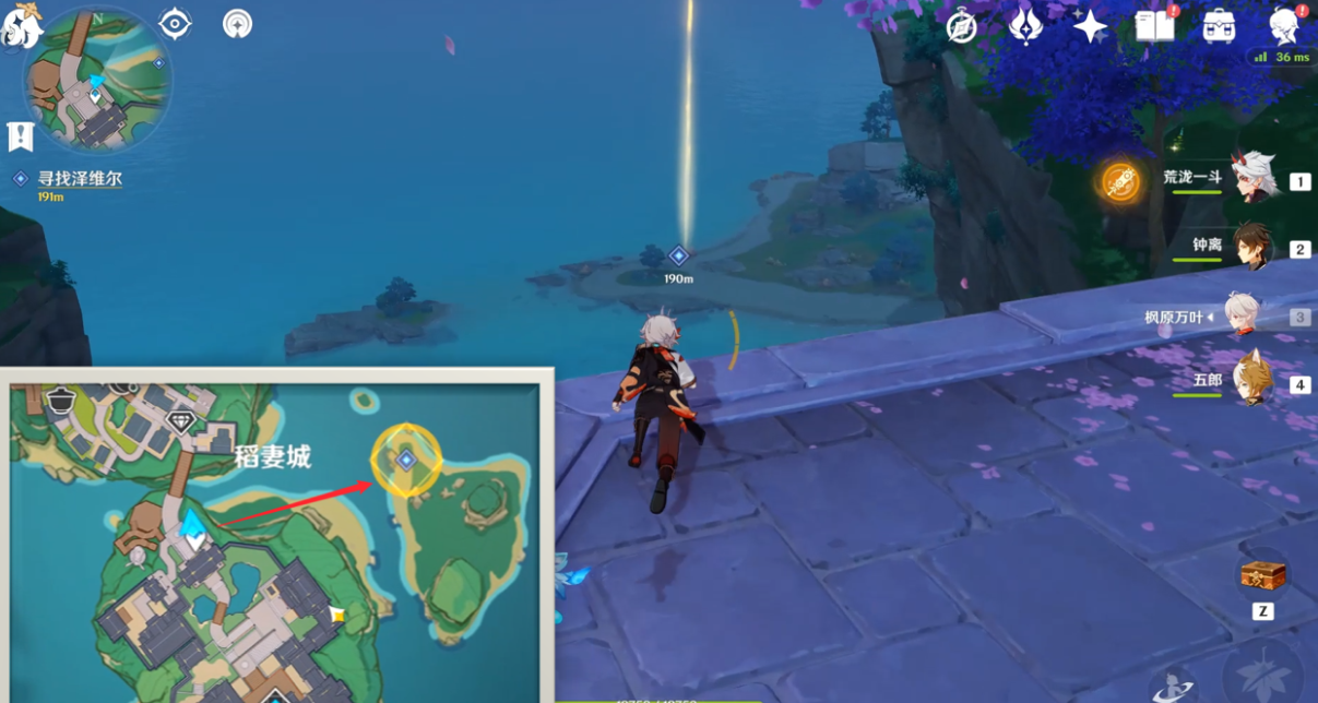 来到天守阁前的传送锚点处,泽维尔在右侧的岛屿岸边,靠近后触发对话即可