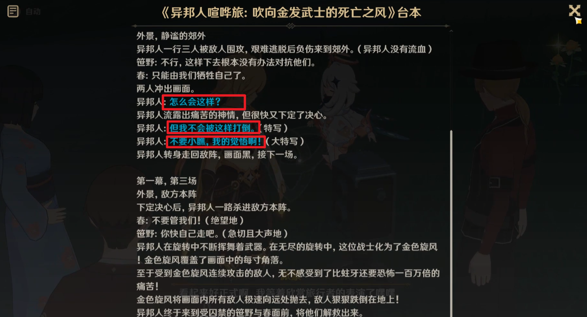 ※注意:重点关注异邦人的台词中蓝色标记的句子,之后需要选择正确的台词哦