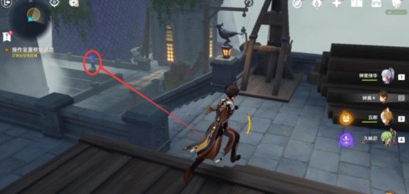 9.之后顺着楼梯往上爬回到平台,然后根据任务指引继续往前走,在楼梯下方发现装置,利用装置完成填补继续前进