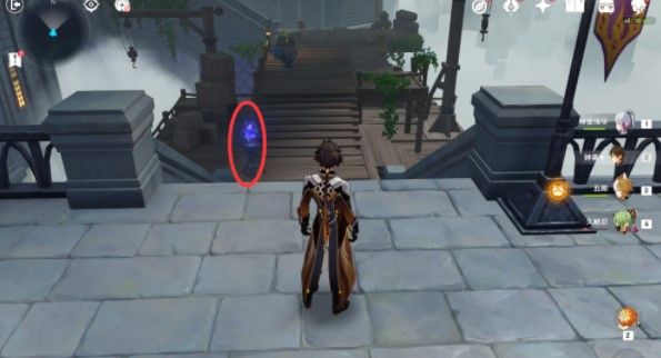 8.在捡完海螺之后大家先别急着走,先往如图所示的地方看,在这里有一个楼梯和一个平台,往下跳之后我们就能看到本秘境的第一个宝箱啦