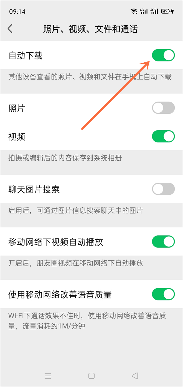 4、将照片、视频、文件和通话页面的自动下载关闭即可。