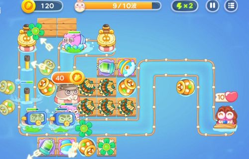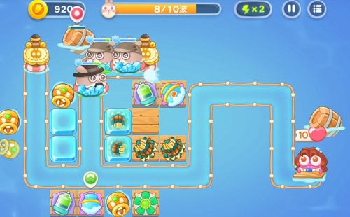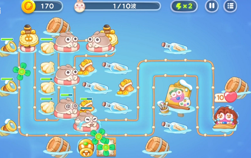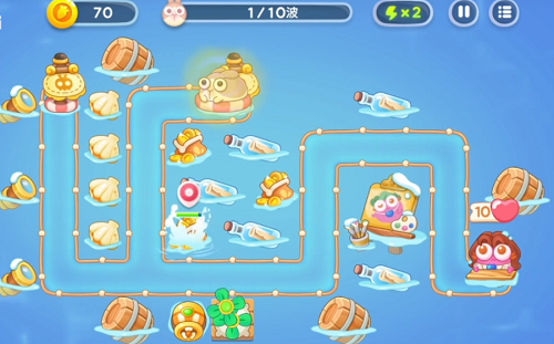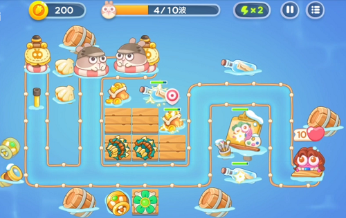 这时候要布置雪球减速了,其实在第4波开始就要布置了,要不然滑板兔跑的太快了。同时冰冻兔也登场了,炮塔密集的地方尽量避免打死冰冻兔。鱼雷尽量布置在出口,能尽早打掉潜水兔的护甲。