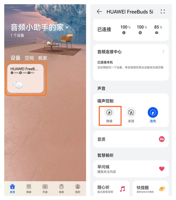 1、连接耳机后,打开智慧生活App,点击耳机卡片页,再在噪声控制中点击降噪。