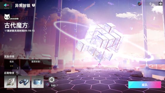异常封锁是周期为一天的特殊挑战关卡,每日上午5点开始,晚上23点59分59秒结束。在开启期间,所有玩家挑战同一个大型BOSS(目前为古代魔方),在规定回合内尽可能的打出更高的输出,根据造成的输出领取相应的奖励,同时也会根据伤害量进行排名,领取排名奖励。