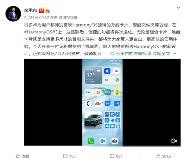 其中最容易被用户感受到的就是全新的桌面体系,从余承东晒出的桌面录屏就能看到,HarmonyOS 3上的万能卡片自定义程度非常高,还可以组合、堆叠各种不同的卡片,桌面图标合并且自定义文件夹大小、样式。