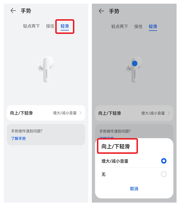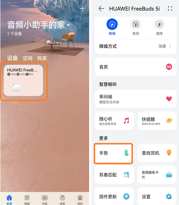 1、从智慧生活App进入耳机卡片后,点击手势。