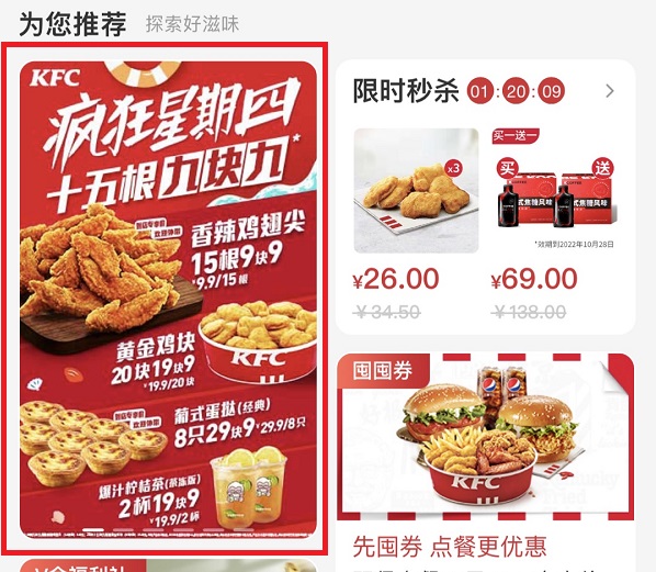 2、打开之后找到“为您推荐”,点击进入“肯德基疯狂星期四”。
