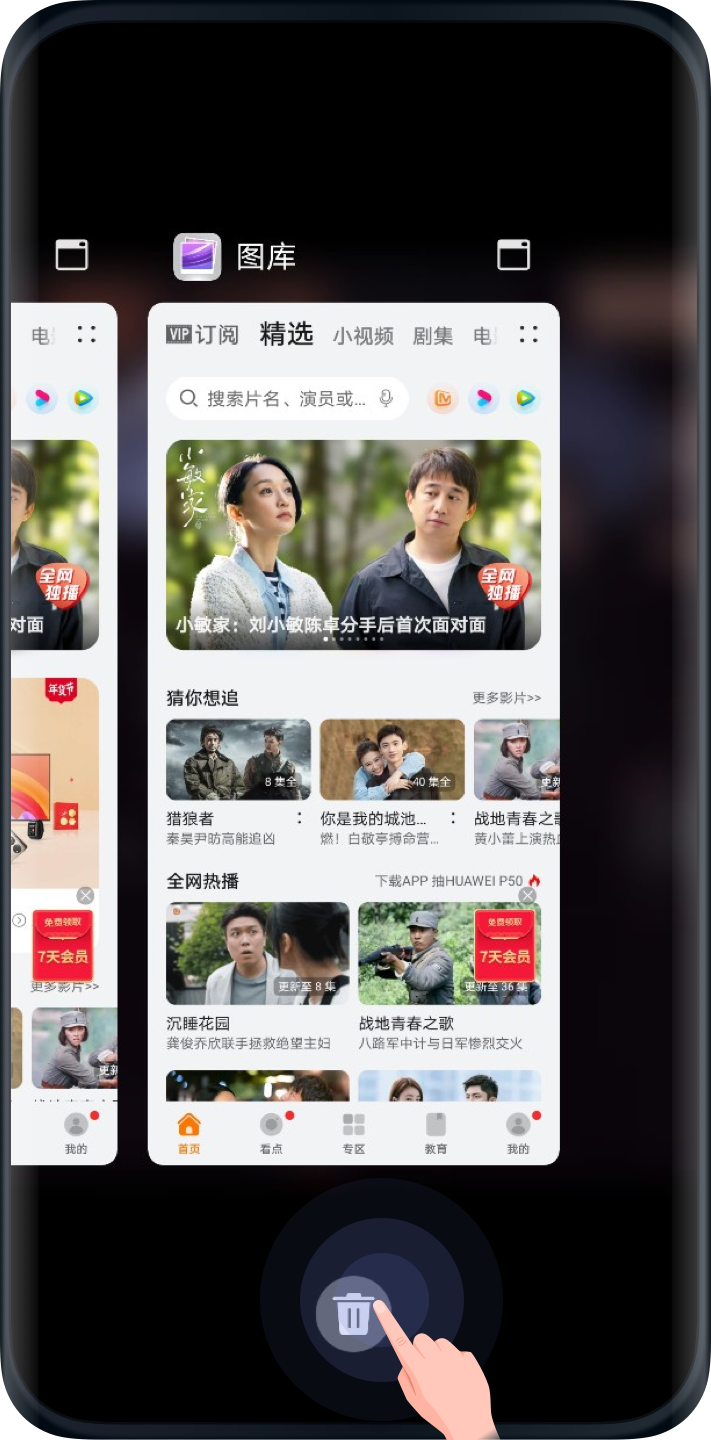 2、上滑手机界面进入任务管理器模式,点击垃圾桶按钮或向上滑图库界面,即可强制关闭应用后台运行,再次进入图库时,即可恢复。