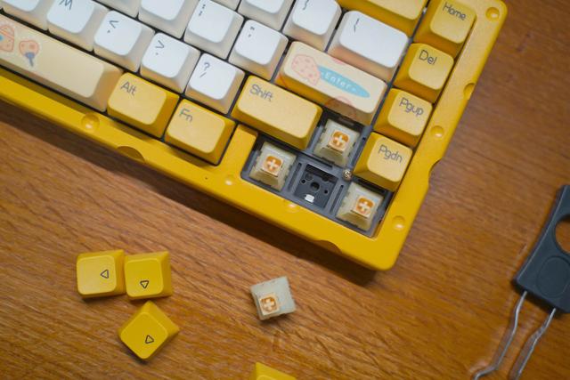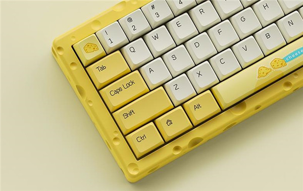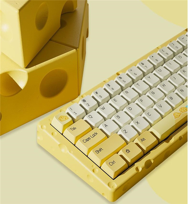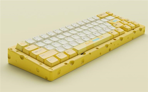 黑爵AC067奶酪键盘外观设计上,这款键盘采用紧凑型的65%配列布局,拥有67键,但这并不是它的主打卖点。拥有“杰瑞鼠”元素的奶酪主题才是主角,得益于黑爵精巧的设计,让键盘的底板部分看起来就像一块奶酪。表面像是被啃过一般,配合黄漆的外表,形象地还原了奶酪的形状。