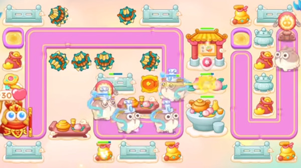 3.打掉之后,在之前酒壶障碍物的位置放一个箭塔,然后锁定下面的大鼎障碍物。把两个靠下的箭塔升到2级。