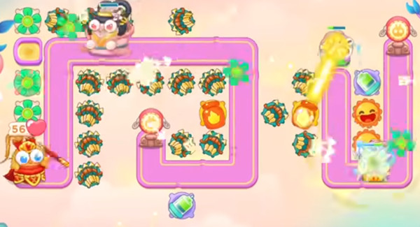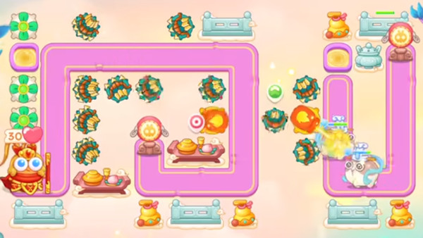 2.由于满级箭塔的散射,会先打掉左边的桃子障碍物,补一个箭塔。打掉酒壶之后锁定上面的栏杆障碍物。