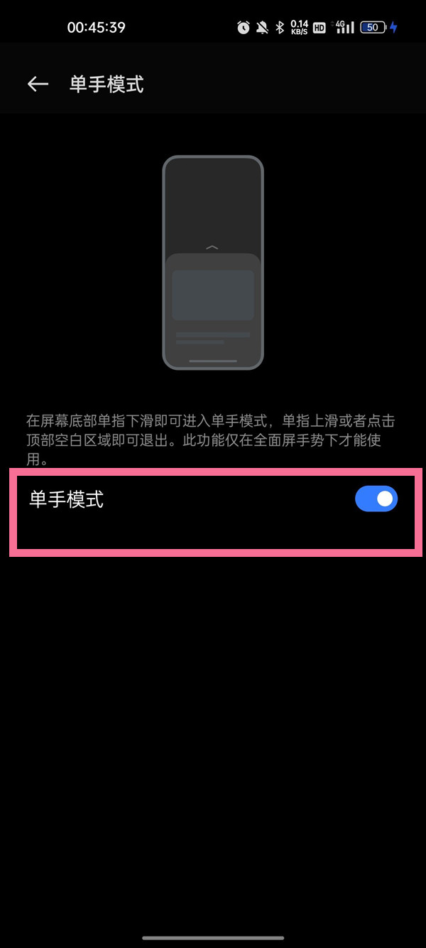 2、点击【单手模式】并开启单手模式即可。