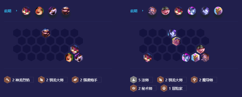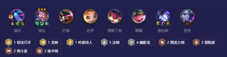 开局抢腰带前期有传送门日炎狂徒都是可以直接合成打连胜的。2-1拉4我们开出能嫖到的最优的羁绊来打连胜。第一套大头瑞兹吸血鬼小炮凑成三法二驯龙一冒险第二套冰鸟璐璐大头猪妹凑成二驯龙二魔导一冒险第三套大头塔母小炮金克斯凑成二驯龙二烈焰二炮手第四套大头瑞兹猪妹李李亚凑成二冒险二重装三法师