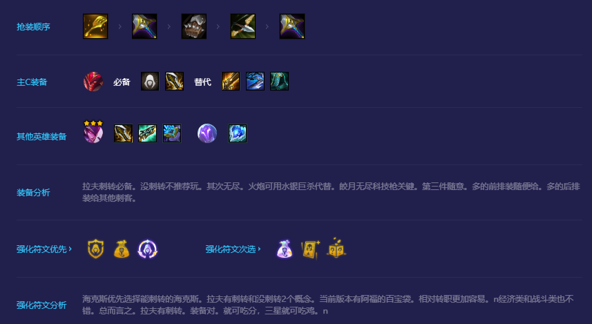 开局优先抢大剑其次攻速拳套都行。前期铲子开局或者第一轮海克斯给刺客转职。或者第一轮野怪给发拉夫直接玩。2阶段推荐连败。有拉夫更佳。叠加拉夫被动。选秀优先考虑刺转或无尽火炮。3-2拉6D。凑出4刺4屠龙即可。切记。没刺转不玩。