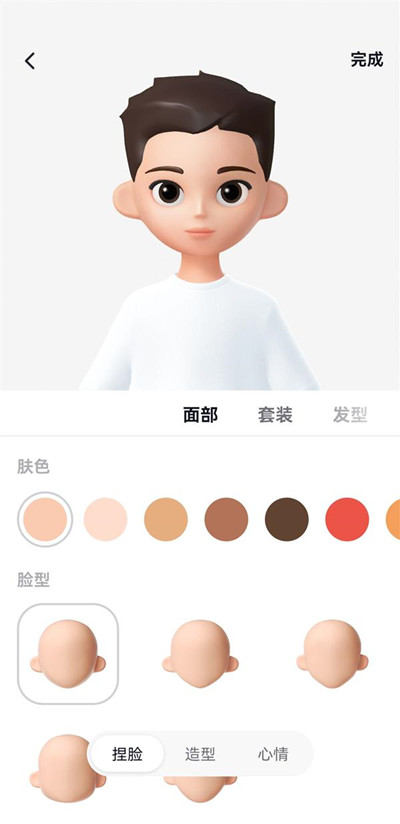3、我们点击创建之后,就可以自定义去捏抖音仔仔形象了,可以对“面部”“造型”等进行自定义设置。