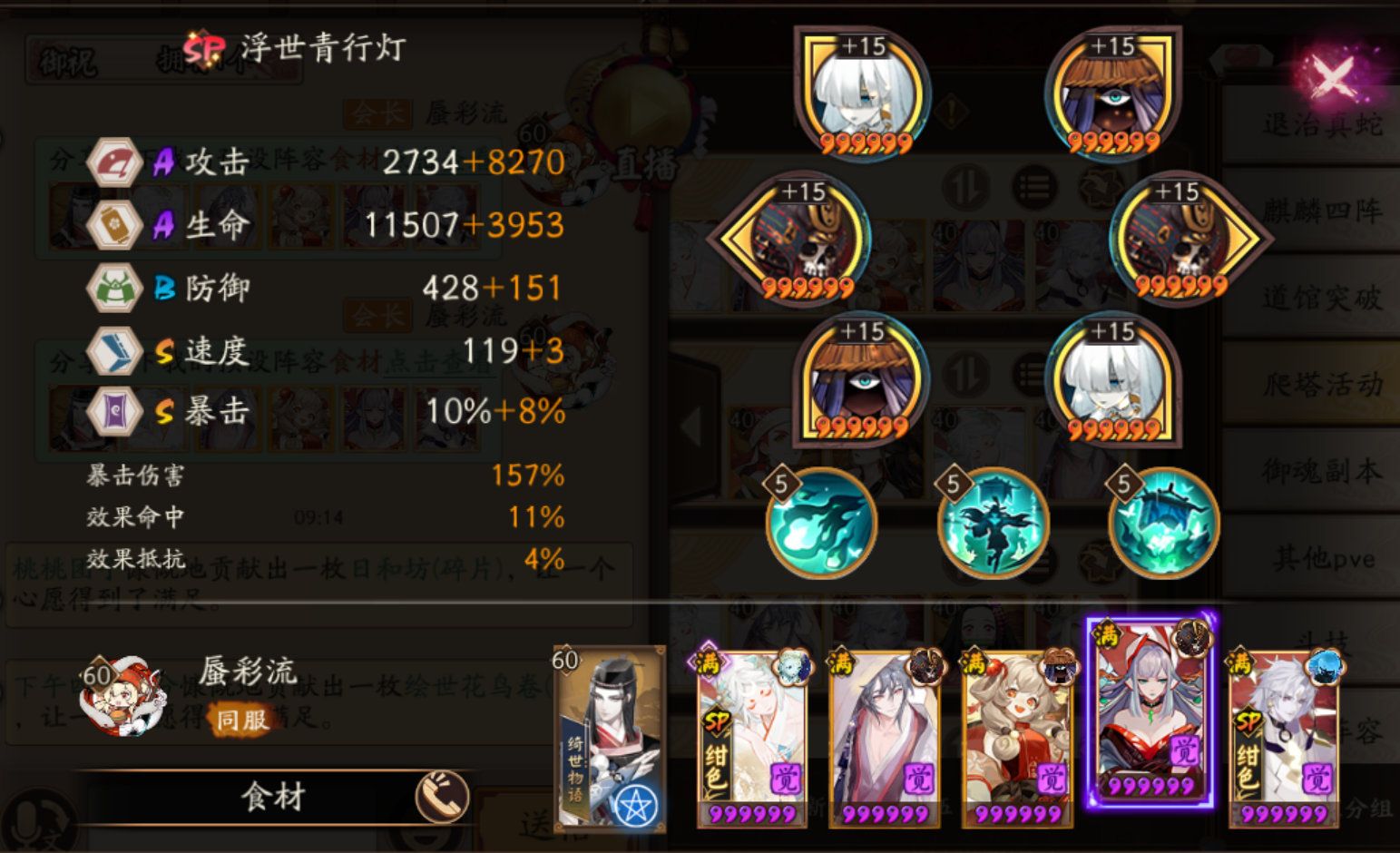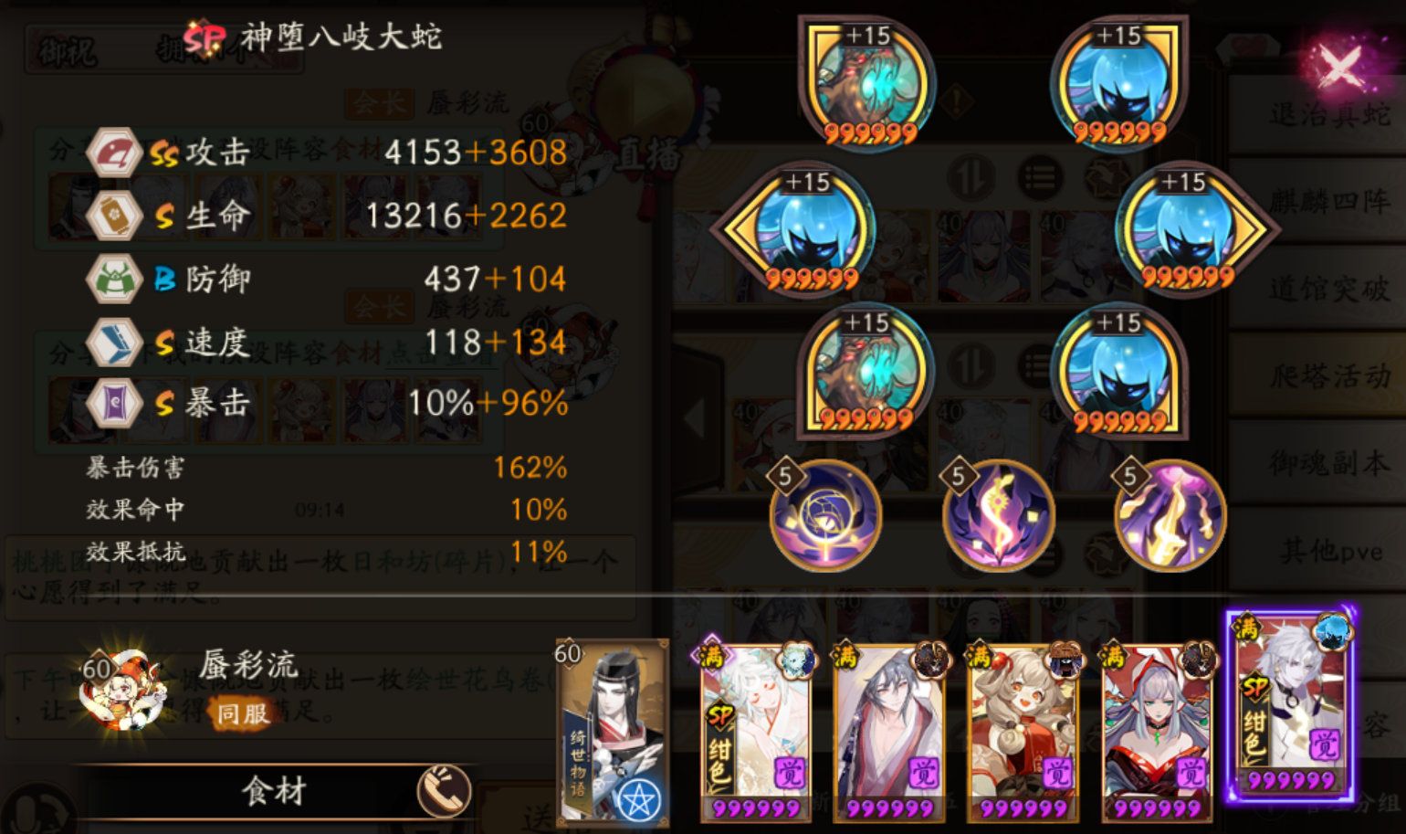 SP大蛇:速攻暴,破荒/破势,满2/3技能,速度大于220