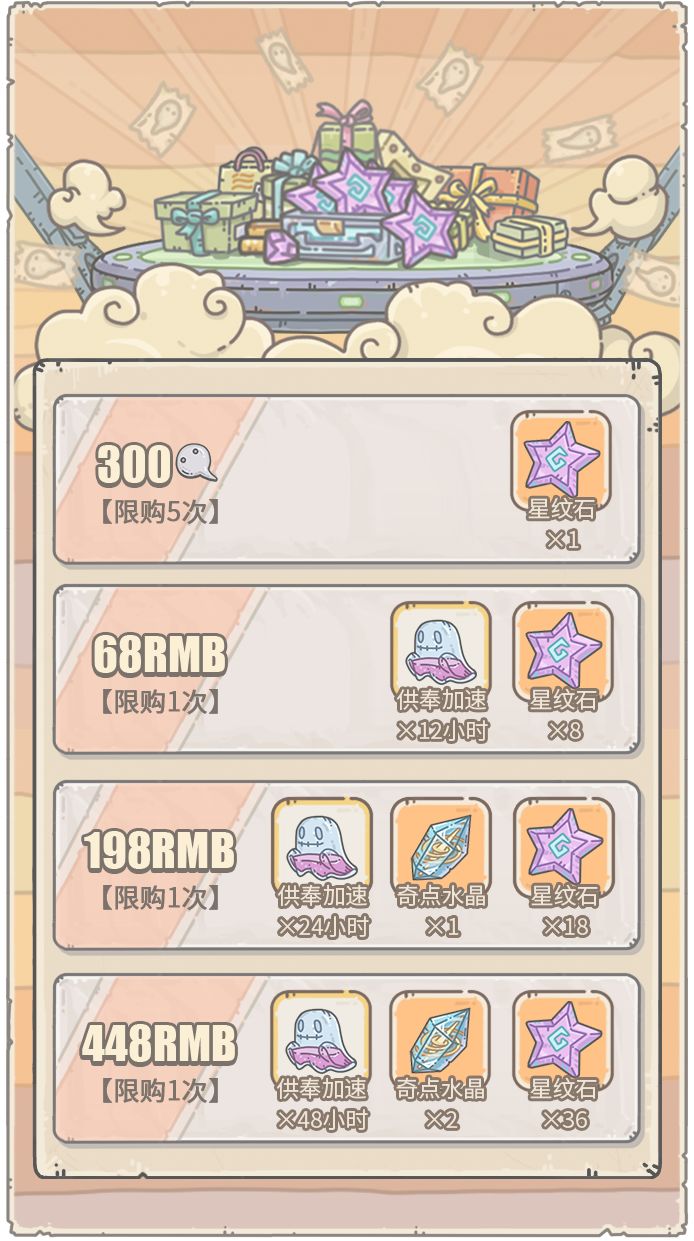 活动期间,贩售机将出现福利礼包,每天5点刷新,售价1白蝌蚪。内容为:供奉加速×30分钟、开发者的灵魂×1、灵能水晶×100