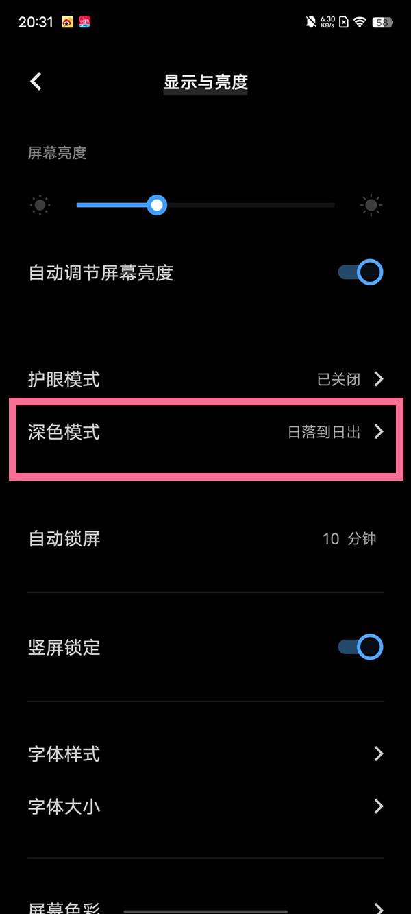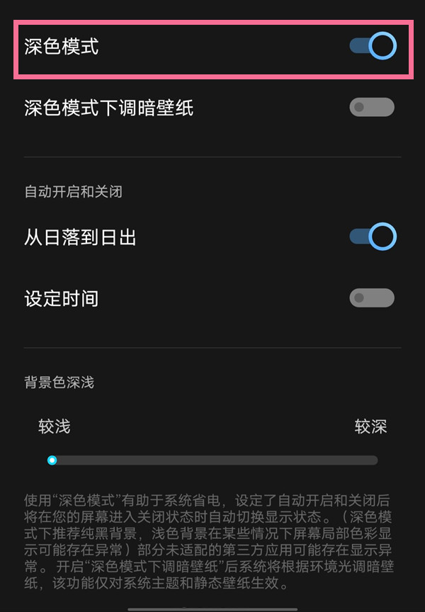 3、打开【深色模式】右侧的开关并设置开启和关闭时间。