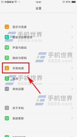 1)打开手机的【设置】,进入设置菜单后再继续点击【手势体感】选项。(如下图)
