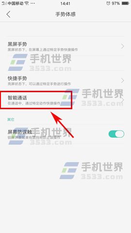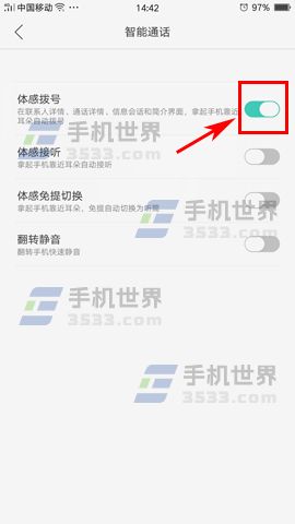 2)接着点击【智能通话】,然后把【体感拨号】开关打开就行了,需要拨号的时候只需找到联系人,接着把手机拿到耳边就会自动拨号而不用再手动点击拨号了,是不是方便多了呢~(如下图)