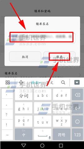 2)然后再点击下面的【锁屏签名】,最后输入完【锁屏签名】内容后再点击【保存】就会显示在锁屏上了。(如下图)
