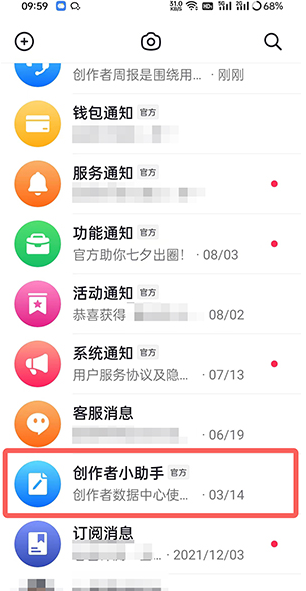 2、接着就可以在消息界面看到【创作者小助手】点击进入其中;