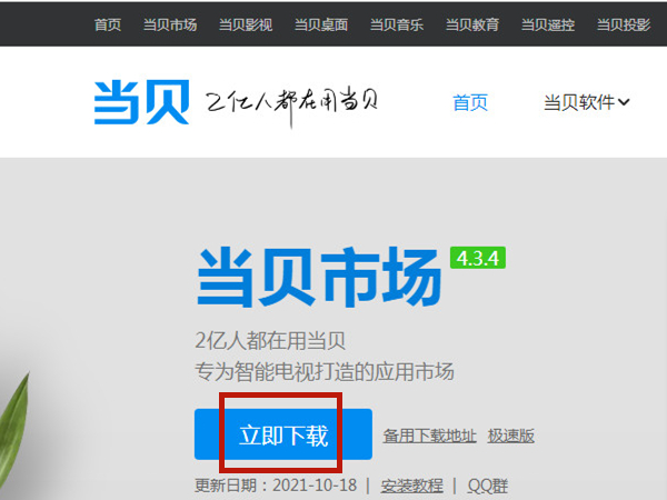 1、进入当贝市场官网后,点击立即下载,将下载文件复制到U盘。