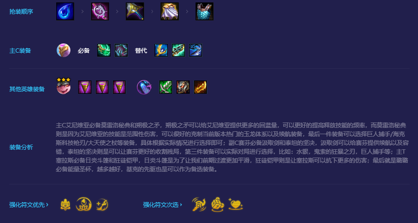 具体情况根据实际对局进行调整,艾尼维亚作为摇摆位,不要被灵风和静止法衣针对,赛芬注意对位到敌方后排即可。