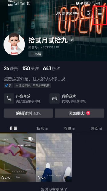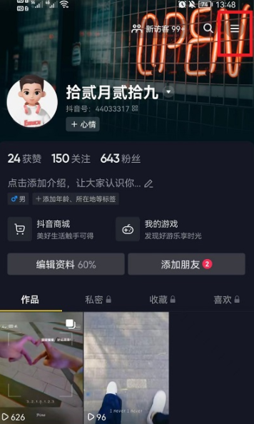 1、在抖音的【我】也就是个人的主页界面之中,用户需要点击其中的【三】在屏幕的右上角的位置;