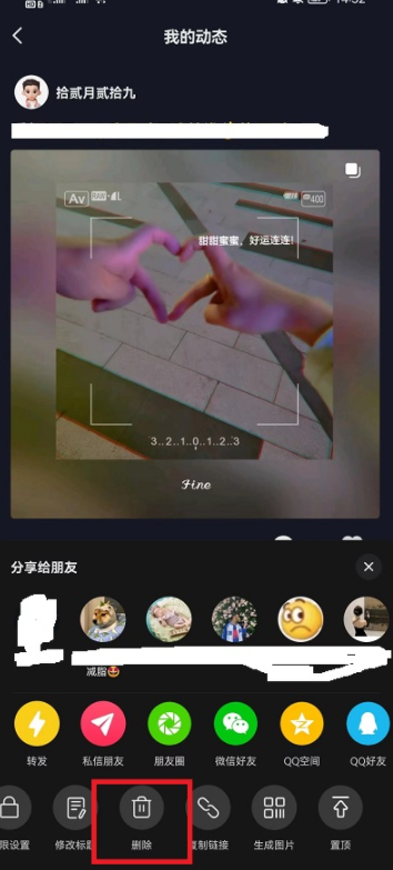 5、最后就会在屏幕下方弹出窗口,左滑窗口中最下面一行,就可以看到其中有一个【删除】功能,点击就可以删除动态。