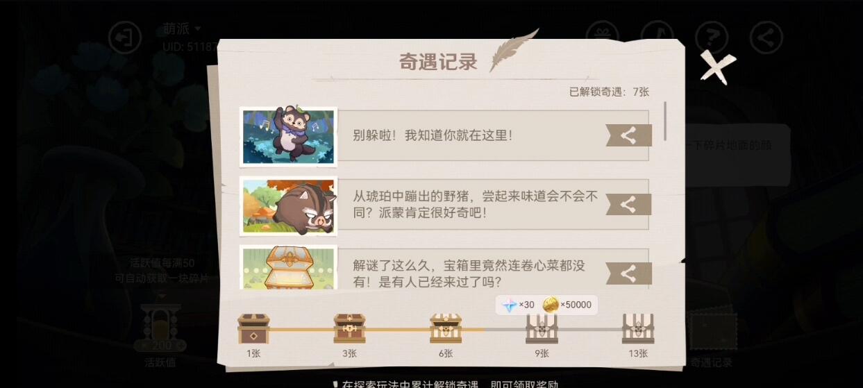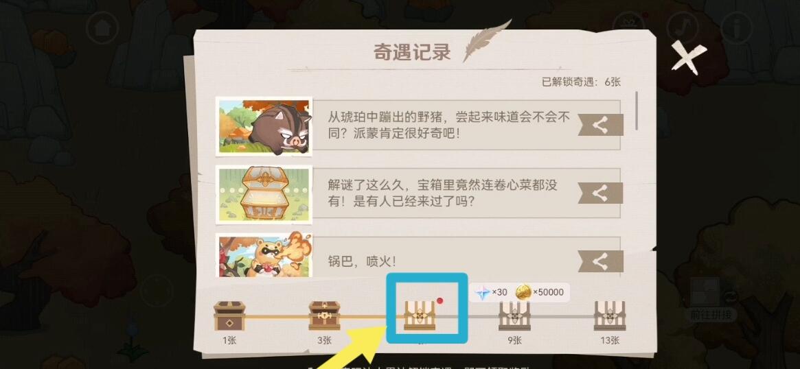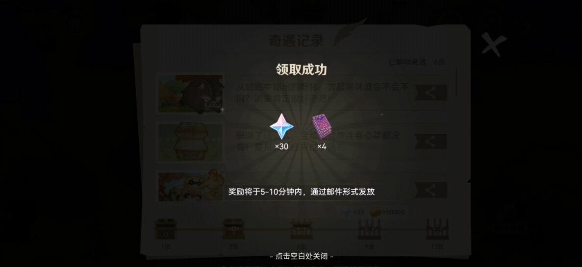 我们做完这两个之后打开[奇遇记录],可以看到又完成了一项,点击即可领取原石x30、大英雄的经验x4