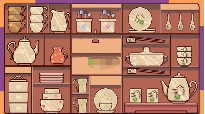 1、这一关包含的餐具类别比较多,首先将带水墨画的茶壶和茶杯放在右下角