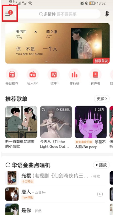1、在网易云音乐软件中,其界面中左上角会有一个【三】按钮,点击此按钮进入到侧边界面;