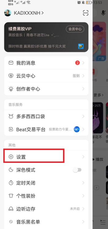2、在弹出的侧边界面中点击其中的【设置】功能,进入到该功能;