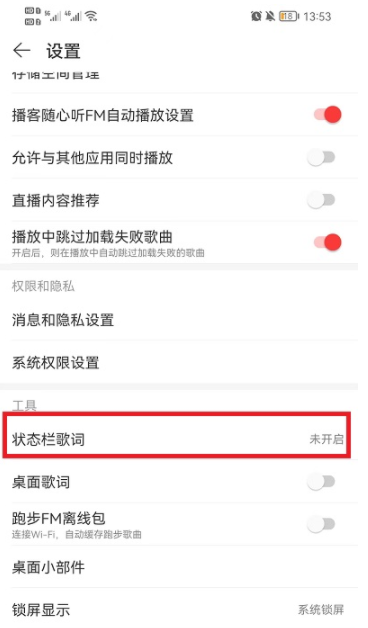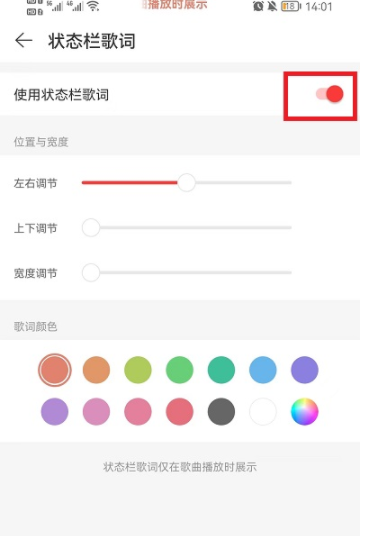 4、随后在其功能界面就可以打开此功能,然后就会在状态栏显示歌词。