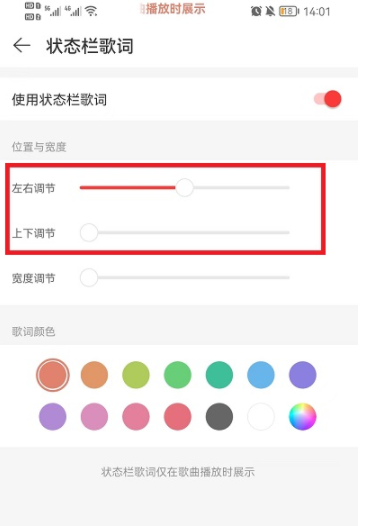 在该功能界面中,拖动下方的【上下调节】【左右调节】就可以调整状态栏歌词在手机屏幕上的位置。